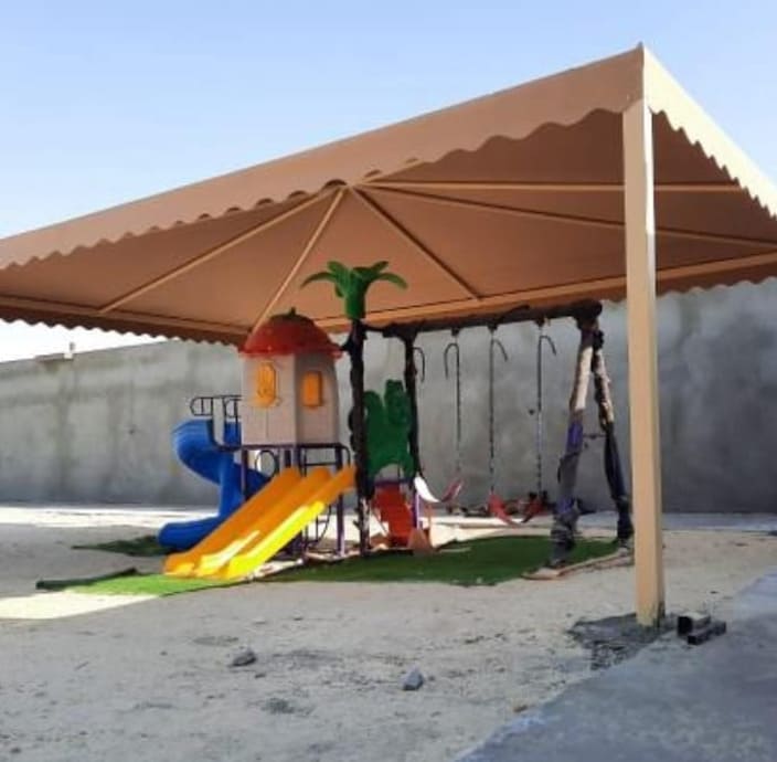 مظلات جلسات يتم تصميمها وتركيبها من الحديد مدمجه مع المجدول البلاستيك.